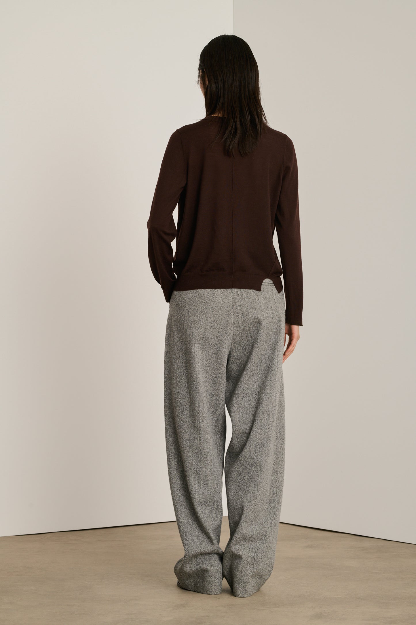 ALYSSA is a relaxed cardigan with a wide V-neckline. It is knitted in extra-fine merino wool to be worn directly on the skin. Asymmetry at the hem, decreases, ribbed trims and inside-out seams are details that add charm to this deceptively classic cardigan.